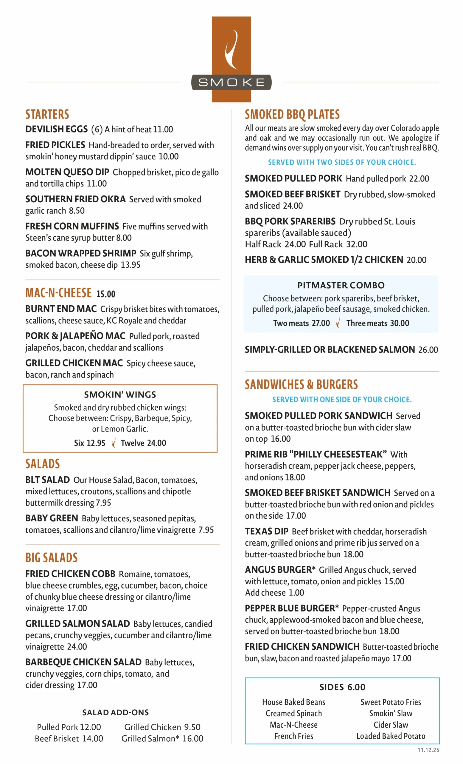 Discover a broad range of accessibly priced options, including lighter fare perfect for smaller appetites. Reservations are accepted, and most of our menu is also available for take-out. Our Glenwood Springs location offers amazing food in the dining room, bar and on the patio, we will be open Tuesday - Thursday 4 PM - 9 PM | Friday and Saturday 12 PM - 9 PM and Sunday 12 PM - 7 PM. We will be closed on Mondays. We also offer a wide variety of catering options.